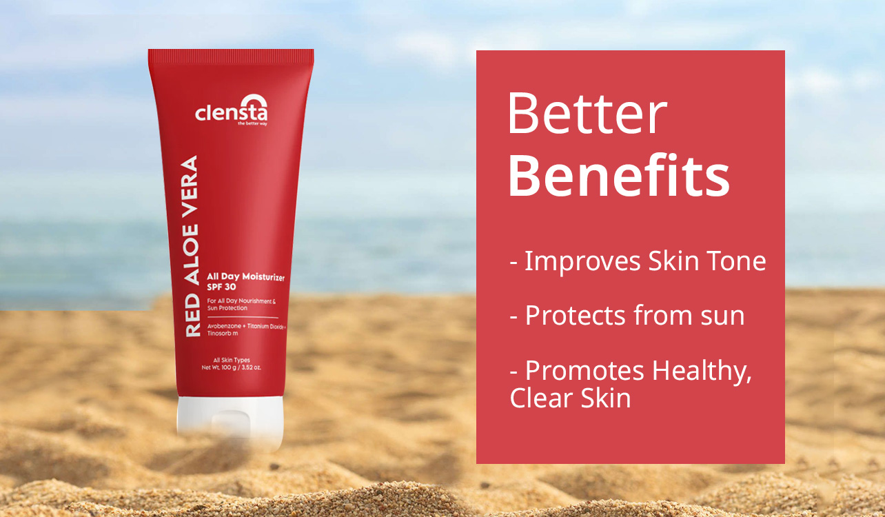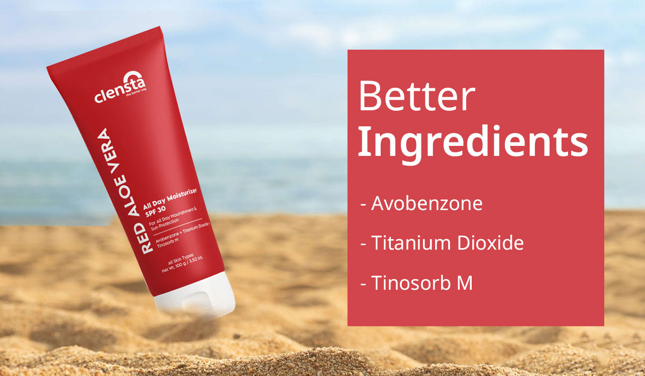 know moreThis all-day, lightweight moisturizer with SPF 30 is enriched with the goodness of Red Aloe Vera. It absorbs quickly and does not feel sticky or oily on the face. It locks the moisture inside our skin and nourishes and calms the skin. This moisturizer is infused with the goodness of actives like Avobenzone which protects from aging and skin cancer, Titanium Dioxide which prevents sunburn and sun damage, and Tinosorb M which provides stability. This all-day moisturizer instantly gets absorbed into the skin, leaving behind soft, smooth, and protected skin. It provides immediate and long-lasting relief from dry skin and protection from harmful sun rays. It has SPF 30 and provides all-day protection from suntan. This sun protection cream is infused with Red Aloe Vera, which offers stress-relieving benefits for your skin. It is best suited for all skin types like dry, oily, or even combination skin.